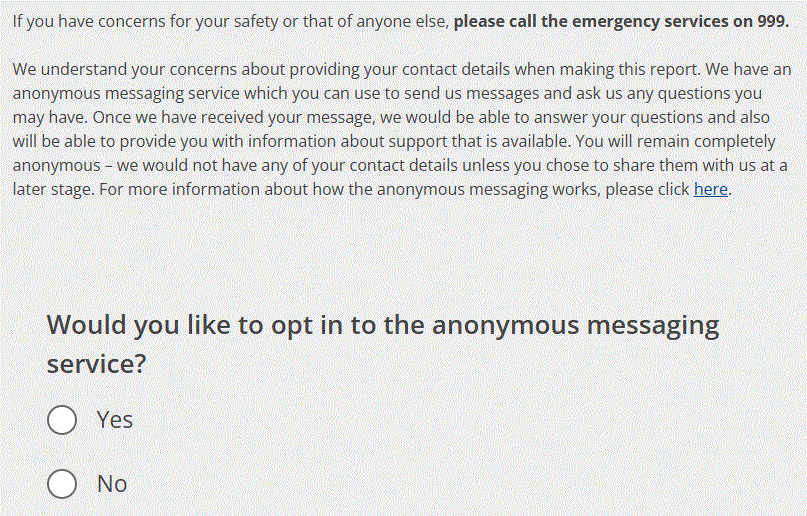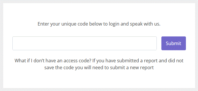 Step 2: Once you have submitted your report, you will be given a unique code. Make sure you take a note of the code as you will not be able to access it later. You can write it down, ‘copy to clipboard’ or screenshot it, or you can save it to your notepad or email it to yourself so that you can copy and paste it easily.